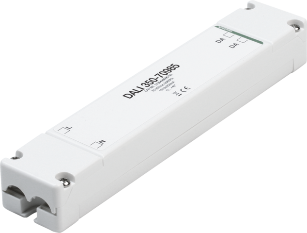 Denne kompakte strømforsyning bruges til at forsyne DALI-bussen og de tilsluttede styringsenheder med strøm. Strømforsyningen kan enten integreres i selve armaturet eller placeres på det nedhængte loft. Den maksimale belastning er 250 mA.