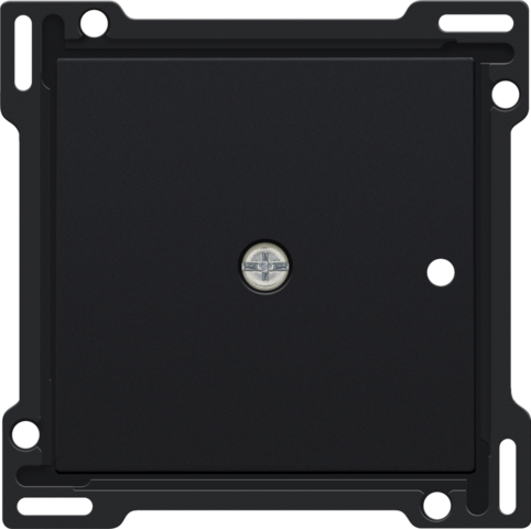 Abdeckung für 1-Kanal-Einbau-RF-Empfänger mit einpoligem (potentialfreiem) Schaltkontakt oder Einbau-RF-Empfänger mit Rollladenfunktion, black coated. Die Abdeckung ist von einem flachen Rand umgeben, der an allen 4 Ecken über eine rechteckige Öffnung verfügt, in der sich jeweils ein multi-positionierbarer Schnapphaken befindet. Der Aufbau der Abdeckung sorgt dafür, dass bei unsorgfältiger Putzarbeit die Blende dank der Schnapphaken stets eng anliegend an der Wand befestigt werden kann. Dies funktioniert in zwei Richtungen: Wenn die Unterputzdose aus dem Putz herausragt, überbrücken die multi-positionierbaren Schnapphaken einen Spielraum von 1 bis 1,2 mm; wenn die Unterputzdose zu tief im Putz eingesunken ist, können die Schnapphaken einen Spielraum von bis zu 1,8 mm überbrücken. Der flache Rand um die Abdeckung herum ist ebenfalls mit 4 runden Öffnungen versehen, die dafür sorgen, dass die Blende korrekt positioniert werden kann im Verhältnis zur Abdeckung. Nach der Montage der gesamten Einheit (Blende, Abdeckung und Mechanismus) sind, dank dem flachen Rand an der Abdeckung, keine Metallteile mehr sichtbar.