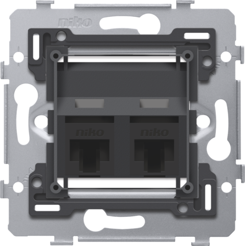 Abdeckung für 2 RJ-Anschlüsse in schräger Ausführung. Die Abdeckung hat ein transparentes Textfeld, in welchem Sie ganz leicht Symbole oder Texte anbringen können. Farbausführung: black coated.