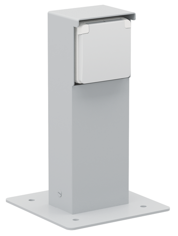 Spritzwassergeschützte Anschlusssäule mit Einzelsteckdose, Schutzkontakt und Bodenplatte, grau.