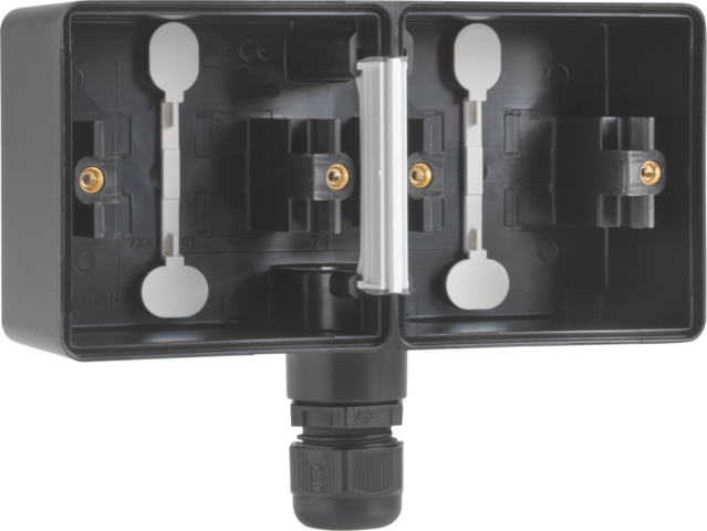 Spritzwassergeschützte, horizontale Doppel-Aufputzdose mit für zwei Funktionen, schwarz