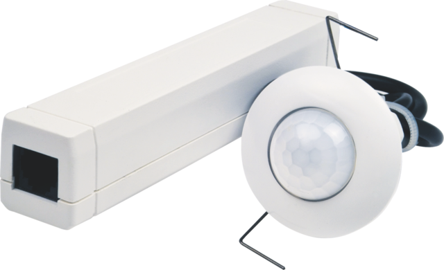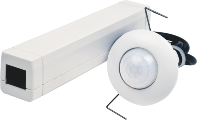 Bewegungsmelder für Montage mit wenig Platzbedarf, kleinste Dimensionen und abgesetze Elektronik. Einstellung nur mit P-IR Fernbedienung oder App und Universal RC. Externer Schalter (ON).