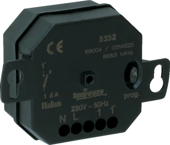 This flush-mounting receiver is used to control a bell, dimmer, motors … It has a 6 A potential-free switch contact. You can choose from 3 modes for the on/off functions.