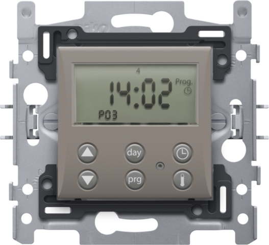 The digital clock thermostat with intelligent control and switching contact 1 A, 230 V is perfectly fitted for temperature control. The thermostat contains a day and week programma and a permanent memory. He is fitted with a finishing set in the colour and was designed for claw fixing. The faceplate needs to be ordered seperately. Finishing colour: greige.