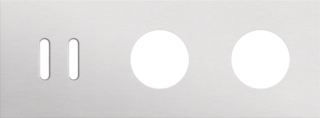 The Niko Rocker threefold horizontally oriented faceplateclicks onto a double switch and two socket outlet functions that have been vertically installed on top of each other with a centre distance of 71 mm. The faceplate combines with any available Niko Rocker double switch function and Niko Rocker and Niko Toggle socket outlet finishing set. The faceplate combines with any available Niko Rocker double switch function and a Niko Rocker and Niko Toggle socket outlet finishing set It consists of an upper frame, light guide and lower frame that are mechanically interconnected. The upper frame is made of brushed aluminium. The lower frame is made of dark grey polycarbonate (PC) + acrylic-styrene-acrylate (ASA). The upper frame is 6 mm thick and the lower frame 2 mm.