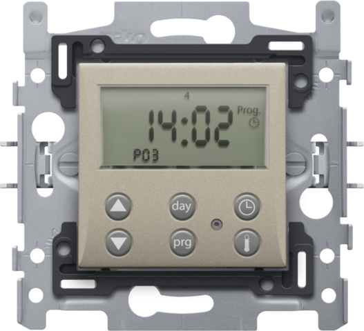 Digital clock thermostat with intelligent control and switching contact 1 A, 230 V for temperature control, champagne coated for claw fixing.