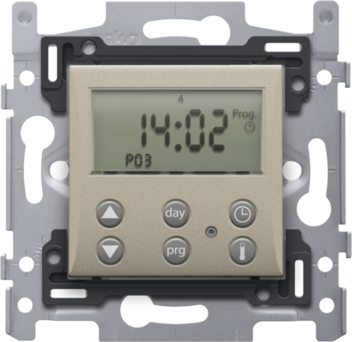 Digital clock thermostat with intelligent control and switching contact 1 A, 230 V for temperature control, champagne coated for screw fixing.