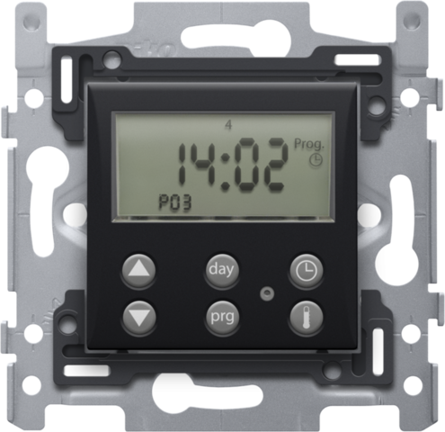 Digital clock thermostat with intelligent control and switching contact 1 A, 230 V for temperature control, black coated for screw fixing.