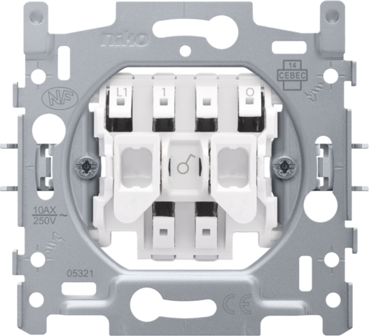 Mechanism for a single-pole control switch, with 3 connection terminals, with claw fixing. This switch can be equipped with an indicator lamp (available as accessory) which indicates whether the light is switched on or not. A finishing set and faceplate in the colour of your choice must be ordered separately.
