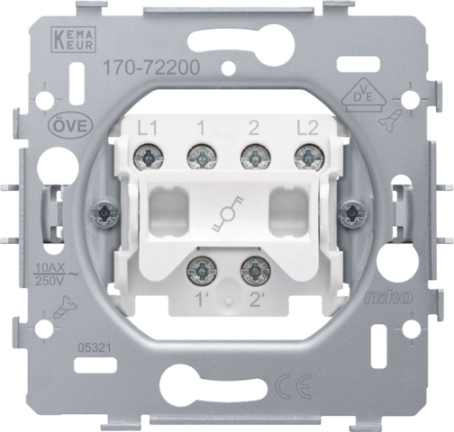 Mechanism for a two-pole two-way switch, with claw fixing. Two-way switches are used to operate one lamp from two different locations. A finishing set and faceplate in the colour of your choice must be ordered separately.