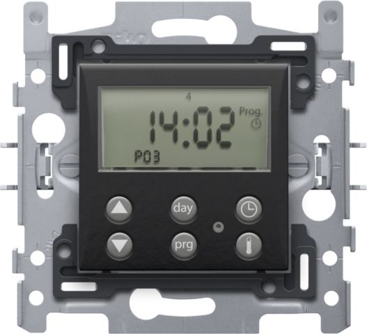 The digital clock thermostat with intelligent control and switching contact 1 A, 230 V is perfectly fitted for temperature control. The thermostat contains a day and week programma and a permanent memory. He is fitted with a finishing set in the colour and was designed for claw fixing. The faceplate needs to be ordered seperately. Finishing colour: piano black coated.