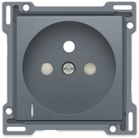 Finishing set for a socket outlet with pin earthing, shutters and hinged lid. This central plate must be used on a socket outlet with overvoltage protection and with a flush-mounting depth of 28.5 mm. Finishing colour: blue grey coated.