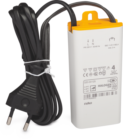 This electronic transformer has a capacity of 150 W and is universally dimmable. It is suitable for the connection of low-voltage loads (12 V). On the primary side, the transformer is equipped with a Euro plug that can be directly connected to a socket outlet. The silicon wire on the secondary side can be directly connected to a spotlight. This transformer is also suitable for flush mounting in furniture. It is equipped with built-in short-circuit, overload and overheating protection. The transformer has an IP40 protection degree.
