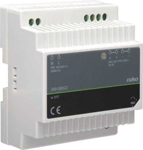 This power supply is suitable for powering LEDs and is designed for DIN-rail mounting. It has a power supply of 50 W. This power supply conforms to the European directive for EMC and safety, EN 61347-2-13.