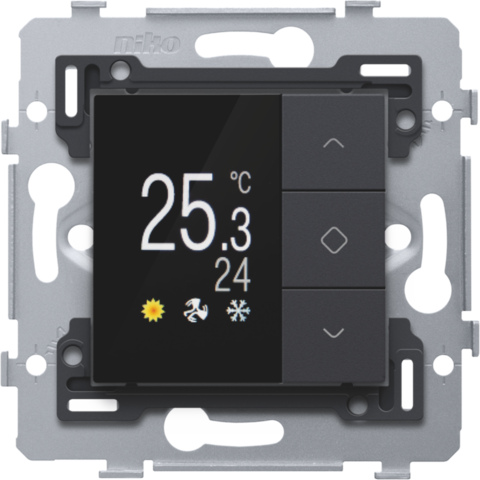 You install the HVAC thermostat in any room that has an indoor unit of the VRV, VRF or multi-split air conditioning system (HVAC system). The HVAC thermostat controls the heating or cooling of the room in which it is installed. You can modify the temperature and adjust the ventilation speed. As Niko Home Control controls the heating or cooling in different rooms, the resident can considerably save energy by linking the HVAC thermostat, for example, to the eco-function (all off) or calendar-based functions. The resident will use the PROTECT mode for long-term absences: the room temperature will be maintained between a minimum and maximum value. The HVAC thermostat works together with the Niko Home Control IP interface and gateway. The communication with the HVAC system is established via the HVAC interface (CoolMaster).
