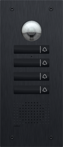 This ultra-flat external video unit for flush mounting is finished with a black front plate made of anodised aluminium (3 mm thick). The device is equipped with a 130° HD colour camera and a Plexiglass name plate that can be engraved. The touch button requires no maintenance and is extremely durable. The external video unit is supplied with a flush-mounting box. This external unit has 4 touch buttons. As this external video unit is not fitted with lights, we recommend that it is only used in locations that are sufficiently lit. In other locations it is better to use the illuminated version in our range. Combined with touchscreen 2 (or a smartphone or tablet) as an internal video unit, access control can be integrated into a Niko Home Control installation via the external video unit. Please note: we recommend providing at least one touchscreen 2 on top of the smartphones and/or tablets, because a wired device is always more reliable than a mobile one.