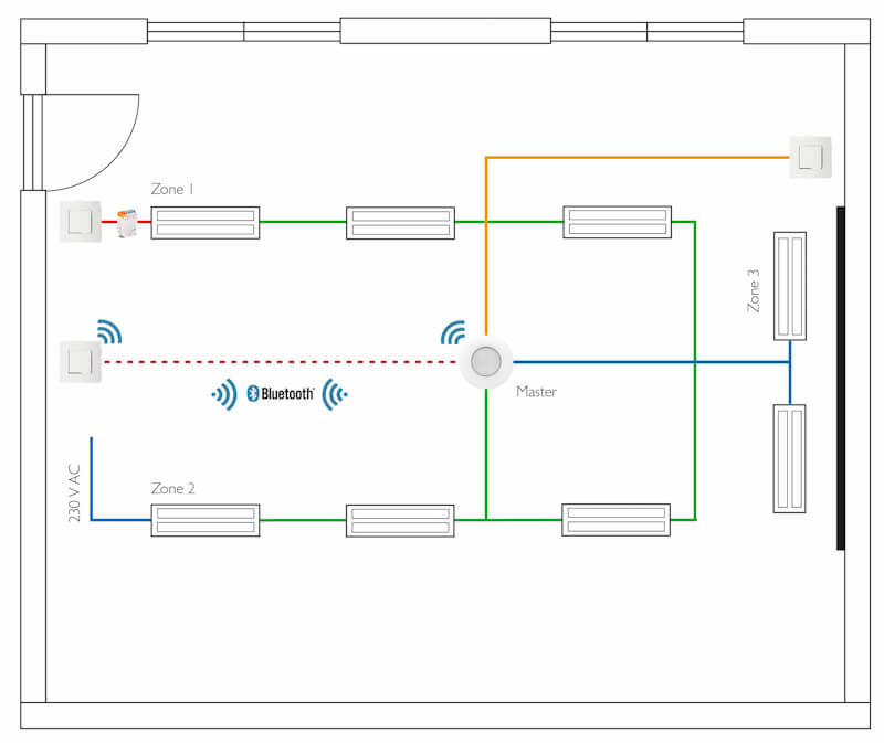 Principle for classroom with blackboard lighting. Dimmable main lighting in two daylight zones + On/Off blackboard lighting. Main lighting and board lighting can be overridden either via a DALI-2 push button interface or a 230 V push-button.