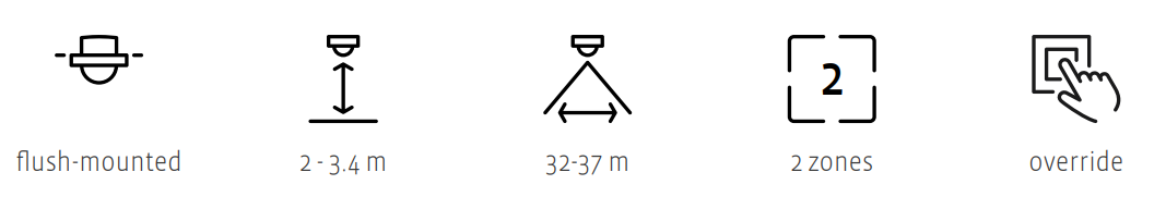 The light can either turn on automatically at presence or by actively pressing a 230 V push-button or via DALI push button interface. The light will switch off after a fixed period of time after the room has been left.