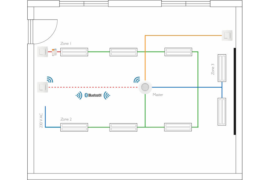 Principle for classroom with dimmable daylight control in two zones + multi zone for smartboard. Override of daylight control and multi zone with a DALI-2 push button interface or by 230V push button.