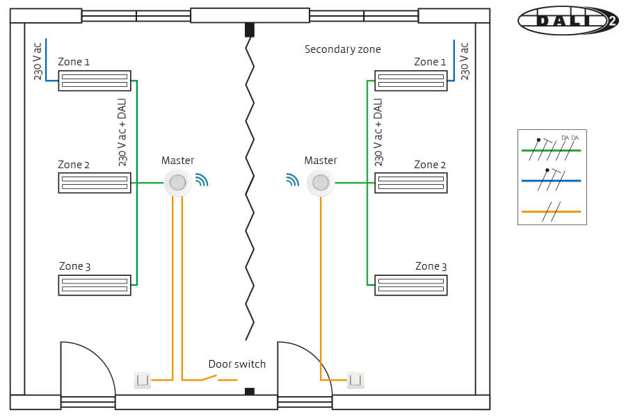 The installation in both rooms has three zones for daylight control. All luminaires are equipped with DALI-2 drivers designed for dimming. A wireless Bluetooth® communication between the master detectors is connecting the lighting control in the divided rooms. When the folding door is open the lighting is overridden uniformly in the joined room. When the folding door is closed the daylight control operates independently of one another in the two rooms. A door switch connected to one of the master