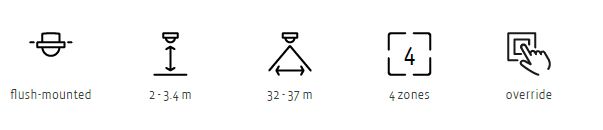 The lighting can either turn on automatically at presence or manually by operating the 230 V push-button or via DALI-2 push button interface. The light will switch off after a fixed period of time after the room has been left.