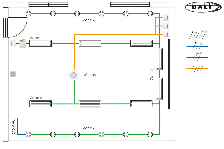 Principle for conference rooms with dimmable daylight control in two zones and one zone, with dimmable rim lighting and one zone for board lighting and as well as power cut-off to a selected wall socket. Override with DALI-2 push button interface and 230V push-button.