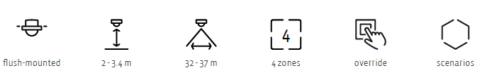 The lighting can either turn on automatically at presence or manually by operating the 230 V push-buttons. The light will switch off after the adjusted period of time after the last person has left the room. Daylight control can be overridden via push-button. Various lighting scenarios can be programmed, up to 16 and activated by operating a push-button. Daylight control can be resumed operating a push-button.