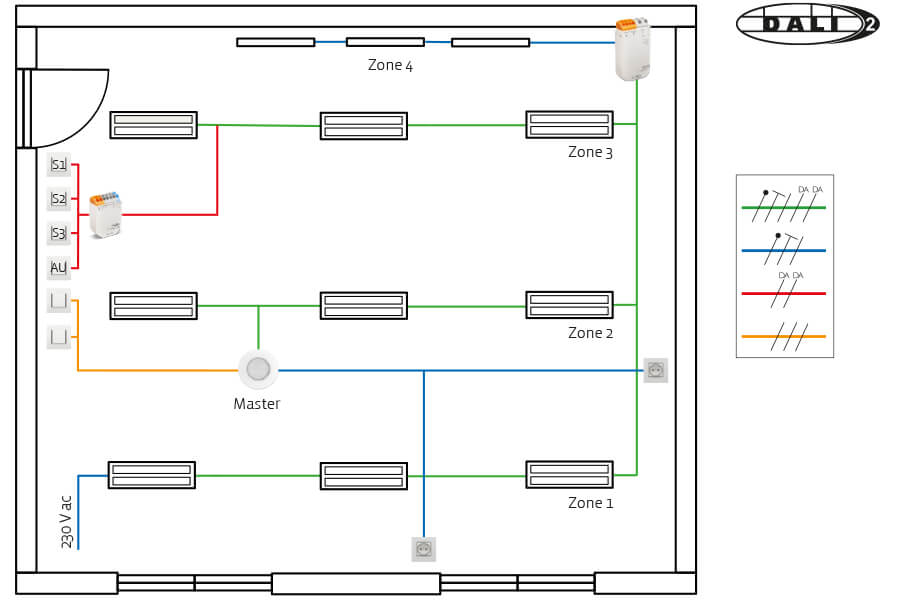The installation has three zones for daylight control and a zone controlled by an external DALI-2 relay. The luminaires in the daylight zones are equipped with DALI-2 drivers designed for dimming. The luminaires in zone 4 are are not equipped with dimmable DALI drivers.