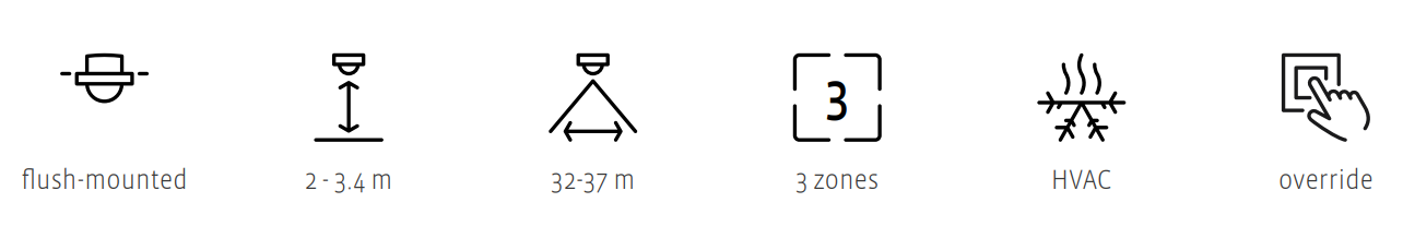 The internal relay of the detector is used to control the HVAC system either as stand-alone in the room or by BMS. The HVAC will start automatically when the detector has registered activity for a adjustable period of time and it will continue for a set time after the last person has left the room.