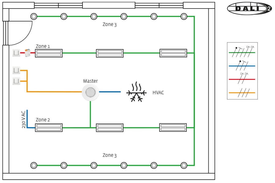 Principle for office with dimmable daylight in two zones + dimmable rim lighting in zone 3, and HVAC. Override of lighting control with DALI-2 push button interface or 230V push-button.