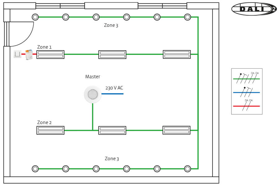 Principle for an office with daylight in two zones. Dimmable main lighting can be overridden either via a DALI-2 push button interface or a 230 V push-button.
