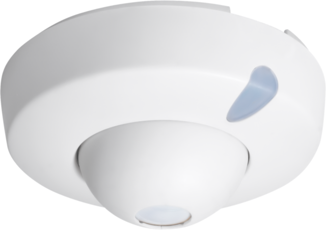 One-channel presence detector with daylight control for ceiling mounting, suitable for switching indoor lighting. Provided with an integrated light sensor. Automatically on/off (after switch-off delay) or manually on/off via N.O. push button (230 Vac) (to be ordered separately). The detection area can be subdivided by means of an adaptable cover mask.