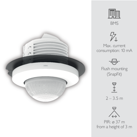 This DALI-2 presence detector can be part of a BMS system. The SnapFit mounting bracket ensures a quick and stable mounting in all types of suspended ceilings with or without removable tiles. The detector needs to be commissioned with the BMS software. The detector’s settings can be modified using the Niko detector tool app or the BMS software.