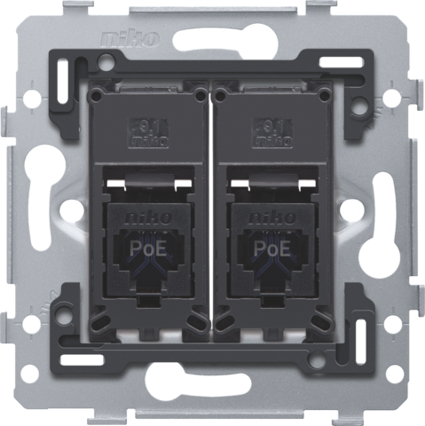 Central plate for 2 RJ outlets, flat model. The central plate has a transparent text field to which you can easily add text or icons. Finishing colour: sterling coated.