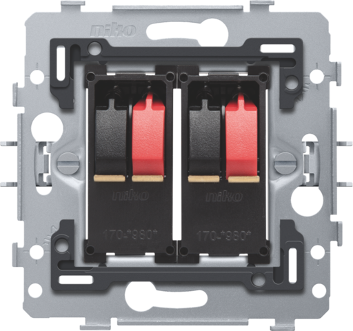 - Function: The central plate is clicked onto the base of the double speaker connection. The central plate has 4 openings: two for the red connection terminals and two for the black connection terminals.