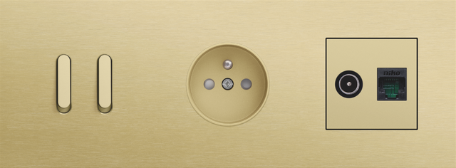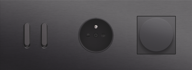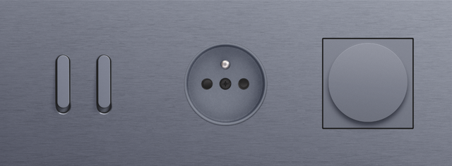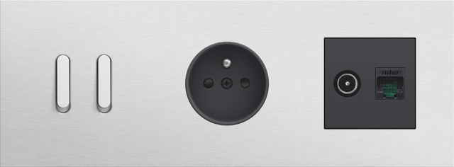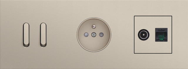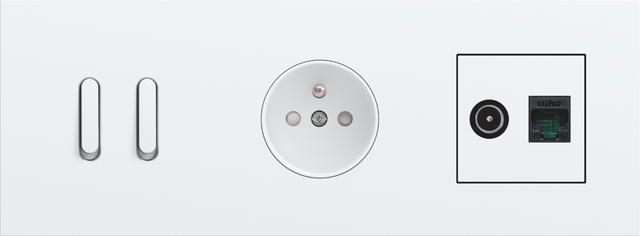The Niko Rocker threefold horizontally oriented faceplate clicks onto a double switch, a socket outlet and a single switch function that have been horizontally installed next to each other with a centre distance of 71 mm. The faceplate combines with any available Niko Rocker for double switch function, Niko Rocker and Niko Toggle socket outlet finishing set and Niko 45 x 45 mm finishing set. It consists of an upper frame, light guide and lower frame that are mechanically interconnected. The upper frame is made of steel. The lower frame is made of white polycarbonate (PC) + acrylic-styrene-acrylate (ASA), white coated. The upper frame is 2 mm thick and the lower frame 6 mm.