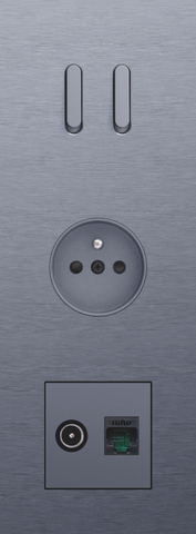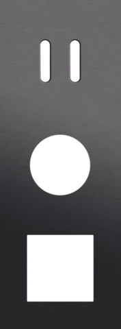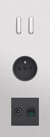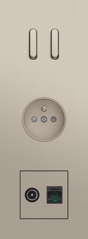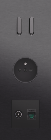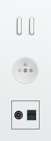 The Niko Rocker threefold vertically oriented faceplate clicks onto a double switch, a socket outlet and a single switch function that have been vertically installed on top of each other with a centre distance of 71 mm. The faceplate combines with any available Niko Rocker for double switch function, Niko Rocker and Niko Toggle socket outlet finishing set and Niko 45 x 45 mm finishing set. It consists of an upper frame, light guide and lower frame that are mechanically interconnected. The upper frame is made of steel. The lower frame is made of white polycarbonate (PC) + acrylic-styrene-acrylate (ASA), white coated. The upper frame is 2 mm thick and the lower frame 6 mm.