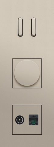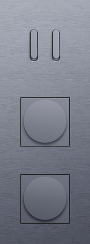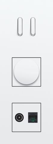 The Niko Rocker threefold vertically oriented faceplate clicks onto a double switch and two 45 x 45 mm functions that have been vertically installed on top of each other with a centre distance of 71 mm. The faceplate combines with any available Niko Rocker for double switch functions and Niko 45 x 45 mm finishing set. It consists of an upper frame, light guide and lower frame that are mechanically interconnected. The upper frame is made of steel. The lower frame is made of white polycarbonate (PC) + acrylic-styrene-acrylate (ASA), white coated. The upper frame is 2 mm thick and the lower frame 6 mm.