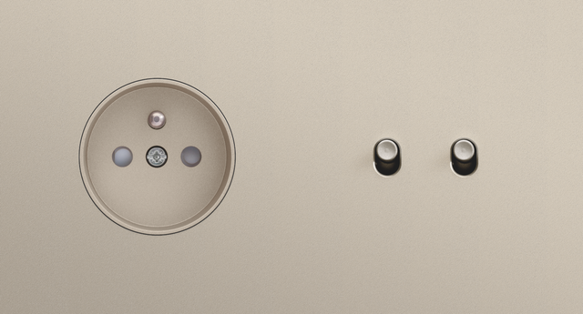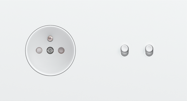 The Niko Toggle twofold horizontally oriented faceplateclicks onto a socket outlet and a double switch function that have been vertically installed on top of each other with a centre distance of 71 mm. The faceplate combines with any available Niko Rocker and Niko Toggle socket outlet finishing set and a Niko Toggle double switch function. It consists of an upper frame, light guide and lower frame that are mechanically interconnected. The upper frame is made of steel. The lower frame is made of white polycarbonate (PC) + acrylic-styrene-acrylate (ASA), white coated. The upper frame is 2 mm thick and the lower frame 6 mm.