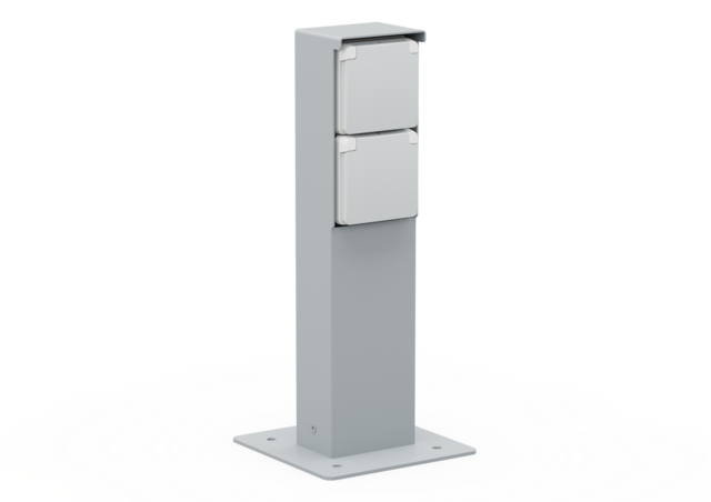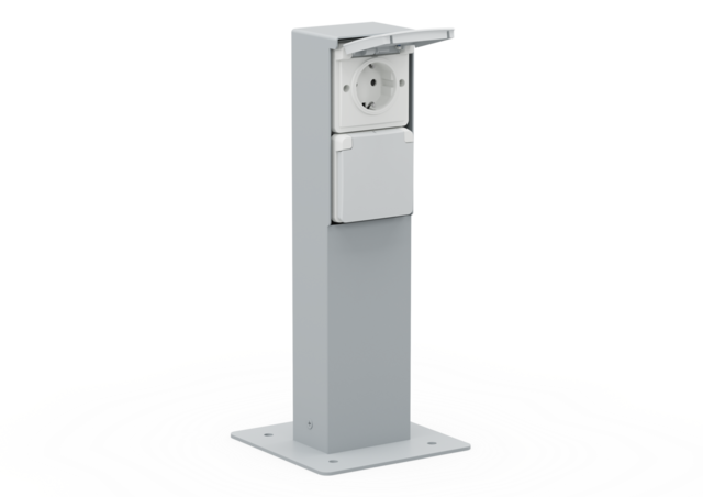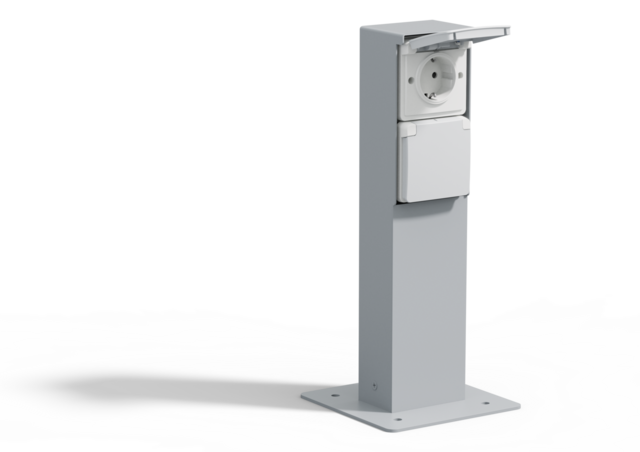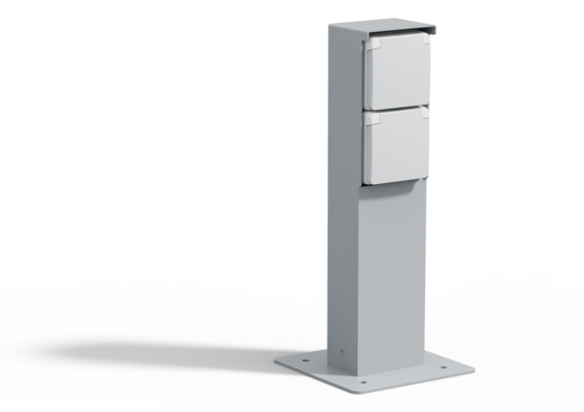 Splashproof garden post with double socket outlet, pin earthing and baseplate, grey. Handmade product: small deviations in form may occur