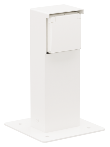 Splashproof garden post with single socket outlet, pin earthing and baseplate, white. Handmade product: small deviations in form may occur