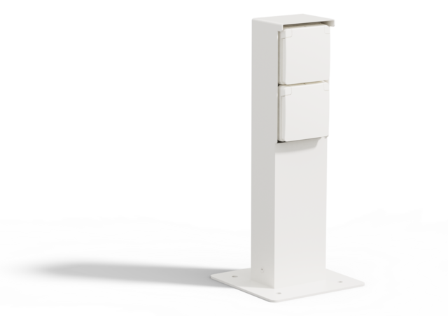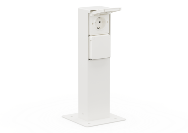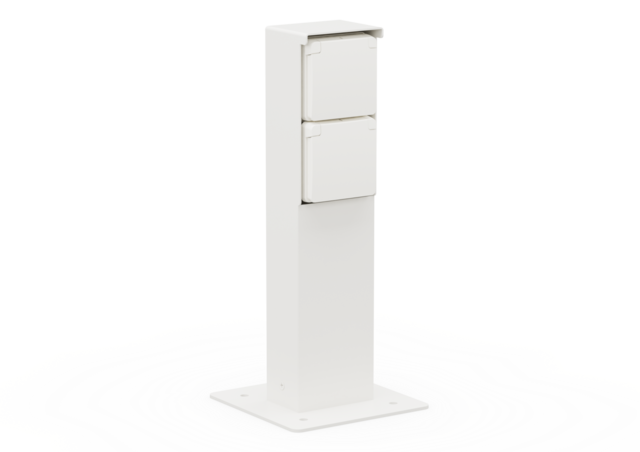 Splashproof garden post with double socket outlet, pin earthing and baseplate, white. Handmade product: small deviations in form may occur