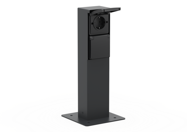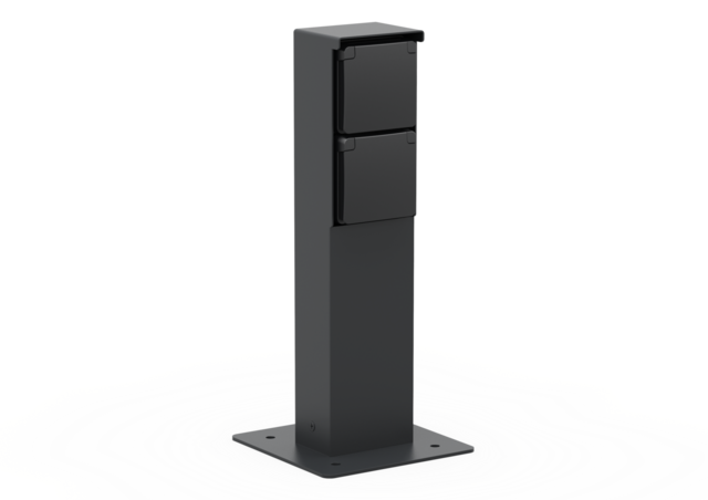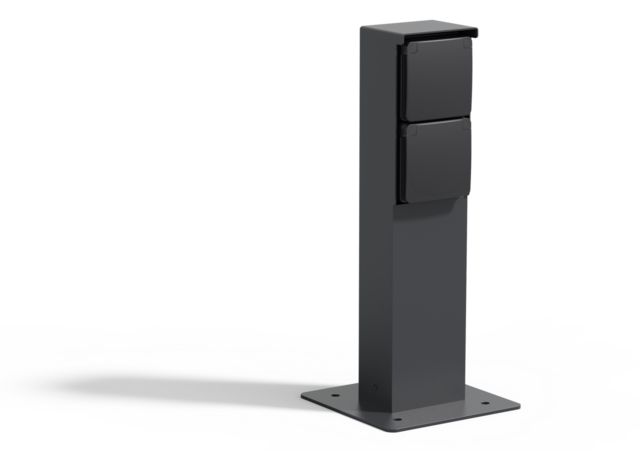 Splashproof garden post with double socket outlet, pin earthing and baseplate, black. Handmade product: small deviations in form may occur