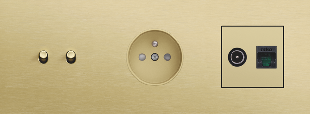The Niko Toggle threefold horizontally oriented faceplate clicks onto a double switch, a socket outlet and a single switch function that have been horizontally installed next to each other with a centre distance of 71 mm. The faceplate combines with any available Niko Toggle for double switch function, Niko Rocker and Niko Toggle socket outlet finishing set and Niko 45 x 45 mm finishing set. It consists of an upper frame, light guide and lower frame that are mechanically interconnected. The upper frame is made of steel. The lower frame is made of white polycarbonate (PC) + acrylic-styrene-acrylate (ASA), white coated. The upper frame is 2 mm thick and the lower frame 6 mm.