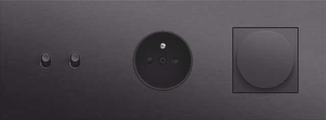Finishing set for a socket outlet with pin earthing and shutters. This central plate must be used with a socket outlet with a flush-mounting depth of 28.5 mm and a Niko Rocker or Niko Toggle socket outlet faceplate. The finishing set has a black screw and black shutters that blend with the rest of the finishing set. Finishing colour: anthracite coated.