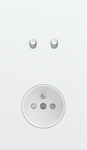 The Niko Toggle twofold vertically oriented faceplate clicks onto a double switch and a socket outlet function that have been vertically installed on top of each other with a centre distance of 60 mm. The faceplate combines with any available Niko Toggle double switch function and a Niko Rocker and Niko Toggle socket outlet finishing set It consists of an upper frame, light guide and lower frame that are mechanically interconnected. The upper frame is made of steel. The lower frame is made of white polycarbonate (PC) + acrylic-styrene-acrylate (ASA), white coated. The upper frame is 2 mm thick and the lower frame 6 mm.