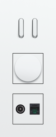 The Niko Rocker threefold vertically oriented faceplate clicks onto a double switch and two 45 x 45 mm functions that have been vertically installed on top of each other with a centre distance of 60 mm. The faceplate combines with any available Niko Rocker for double switch functions and Niko 45 x 45 mm finishing set. It consists of an upper frame, light guide and lower frame that are mechanically interconnected. The upper frame is made of steel. The lower frame is made of white polycarbonate (PC) + acrylic-styrene-acrylate (ASA), white coated. The upper frame is 2 mm thick and the lower frame 6 mm.