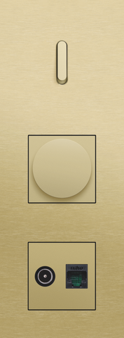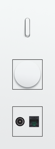 The Niko Rocker threefold vertically oriented faceplate clicks onto a single switch and two 45 x 45 mm functions that have been vertically installed on top of each other with a centre distance of 71 mm. The faceplate combines with any available Niko Rocker for single switch functions and Niko 45 x 45 mm finishing set. It consists of an upper frame, light guide and lower frame that are mechanically interconnected. The upper frame is made of steel. The lower frame is made of white polycarbonate (PC) + acrylic-styrene-acrylate (ASA), white coated. The upper frame is 2 mm thick and the lower frame 6 mm.