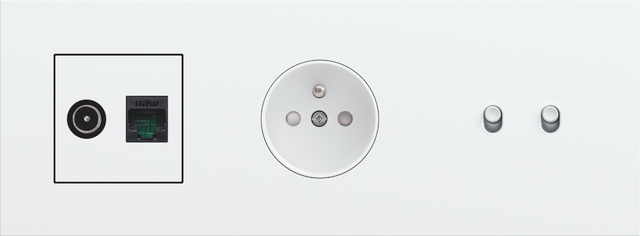 One slot for a 45x45 function, a socket outlet and one double switch function, horizontal 71 mm centre distance, Niko Toggle