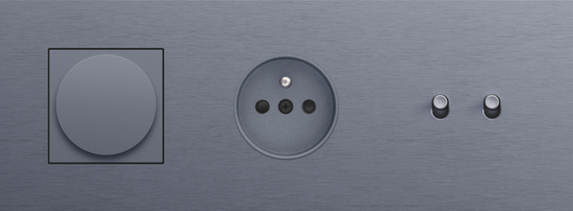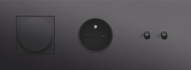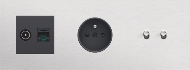 Finishing set for a socket outlet with pin earthing and shutters. This central plate must be used with a socket outlet with a flush-mounting depth of 28.5 mm and a Niko Rocker or Niko Toggle socket outlet faceplate. The finishing set has a black screw and black shutters that blend with the rest of the finishing set. Finishing colour: anthracite coated.